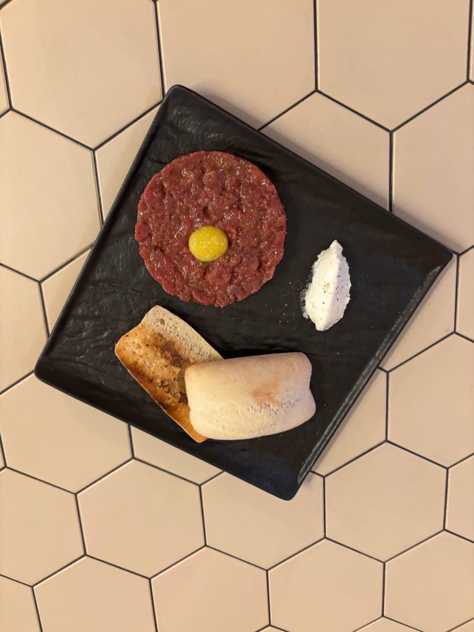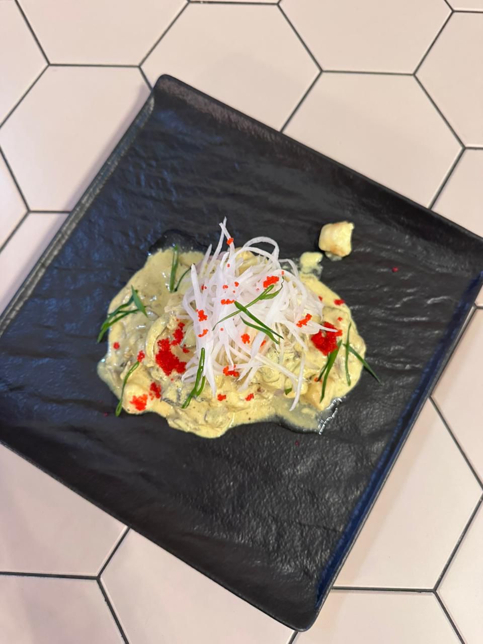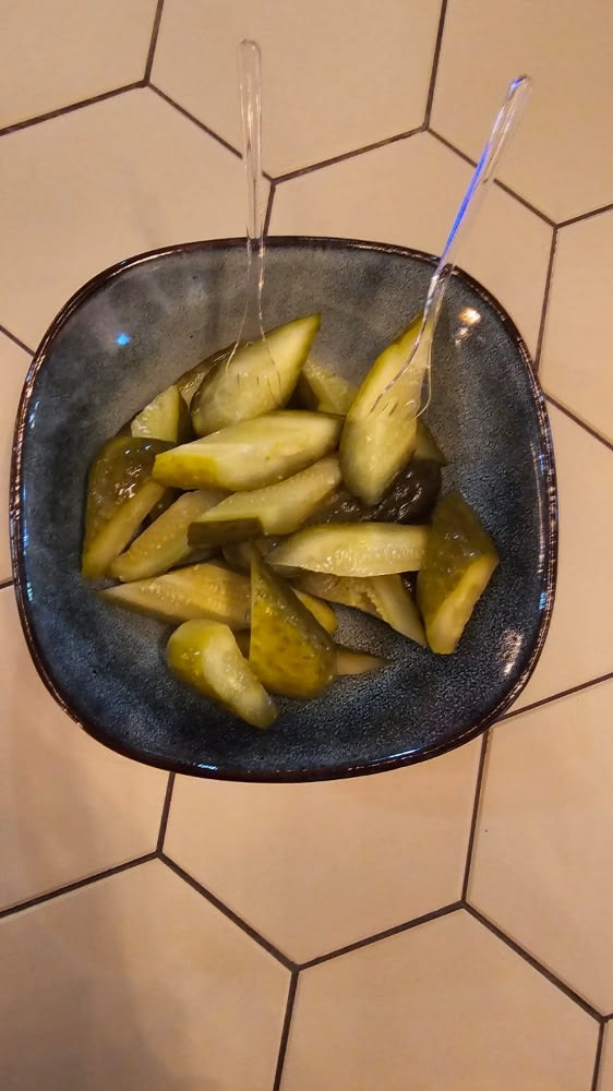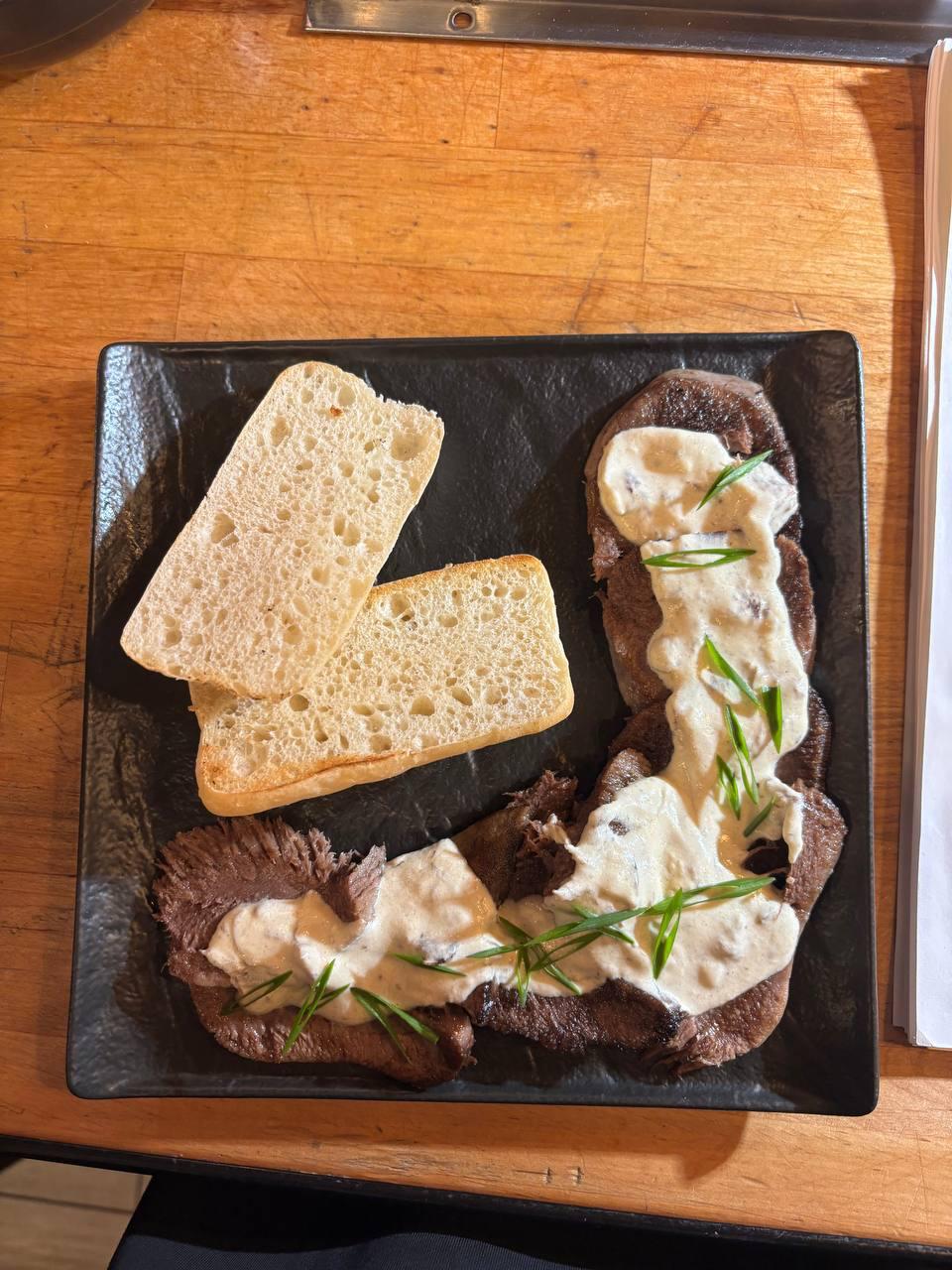 Булочка, сырно-устричный крем, маринованные огурцы, язык говяжий.