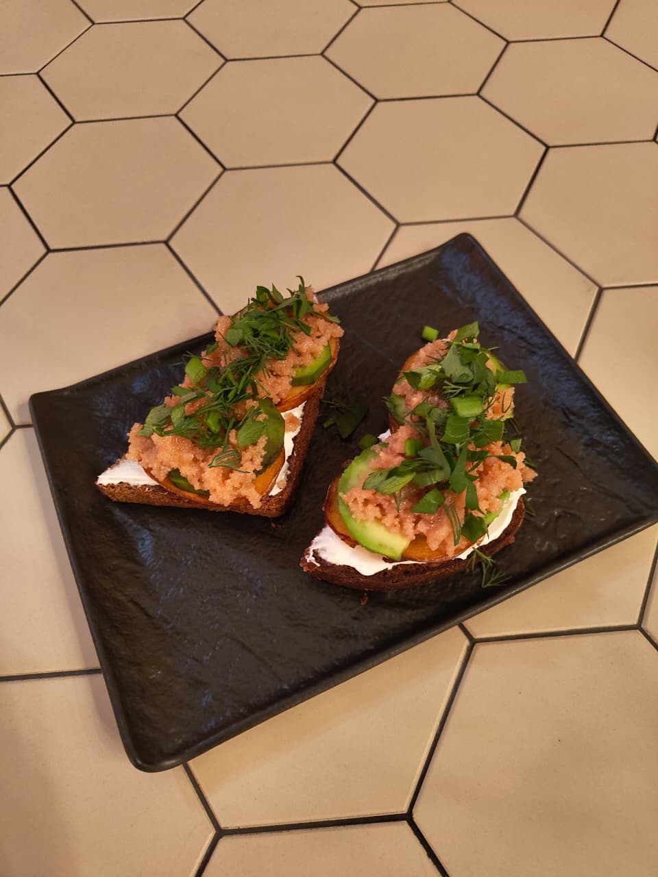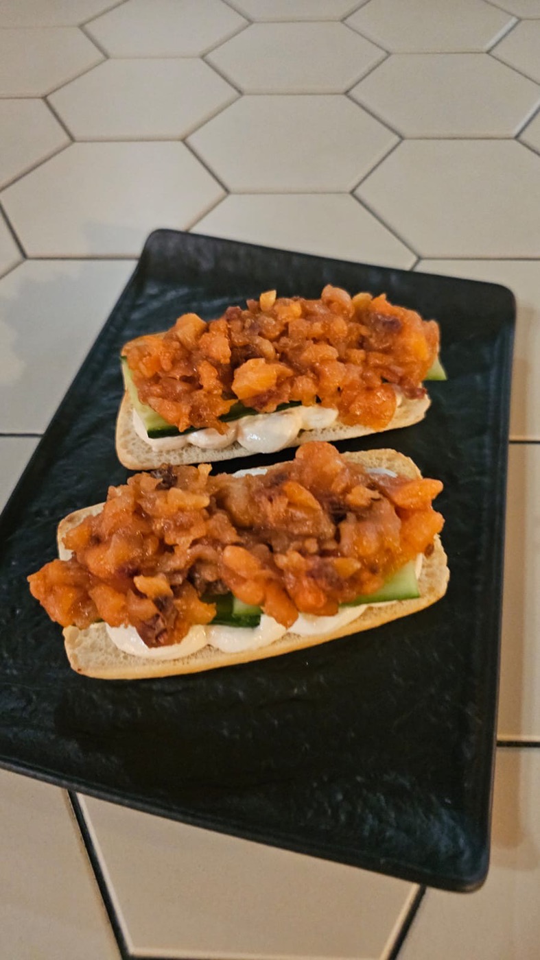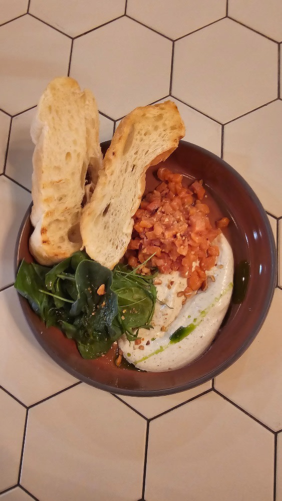 Чиабатта, малосольная форель, сырно устричный крем, вяленые томаты, огурец