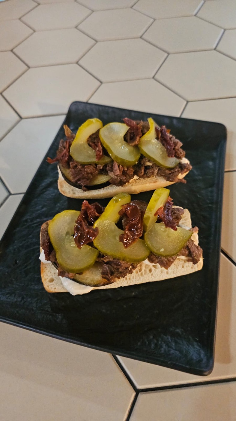 Брускетта со сливочным кремом, томленой говядиной и баклажаном, огурцы маринованные, вяленые томаты 205 гр.