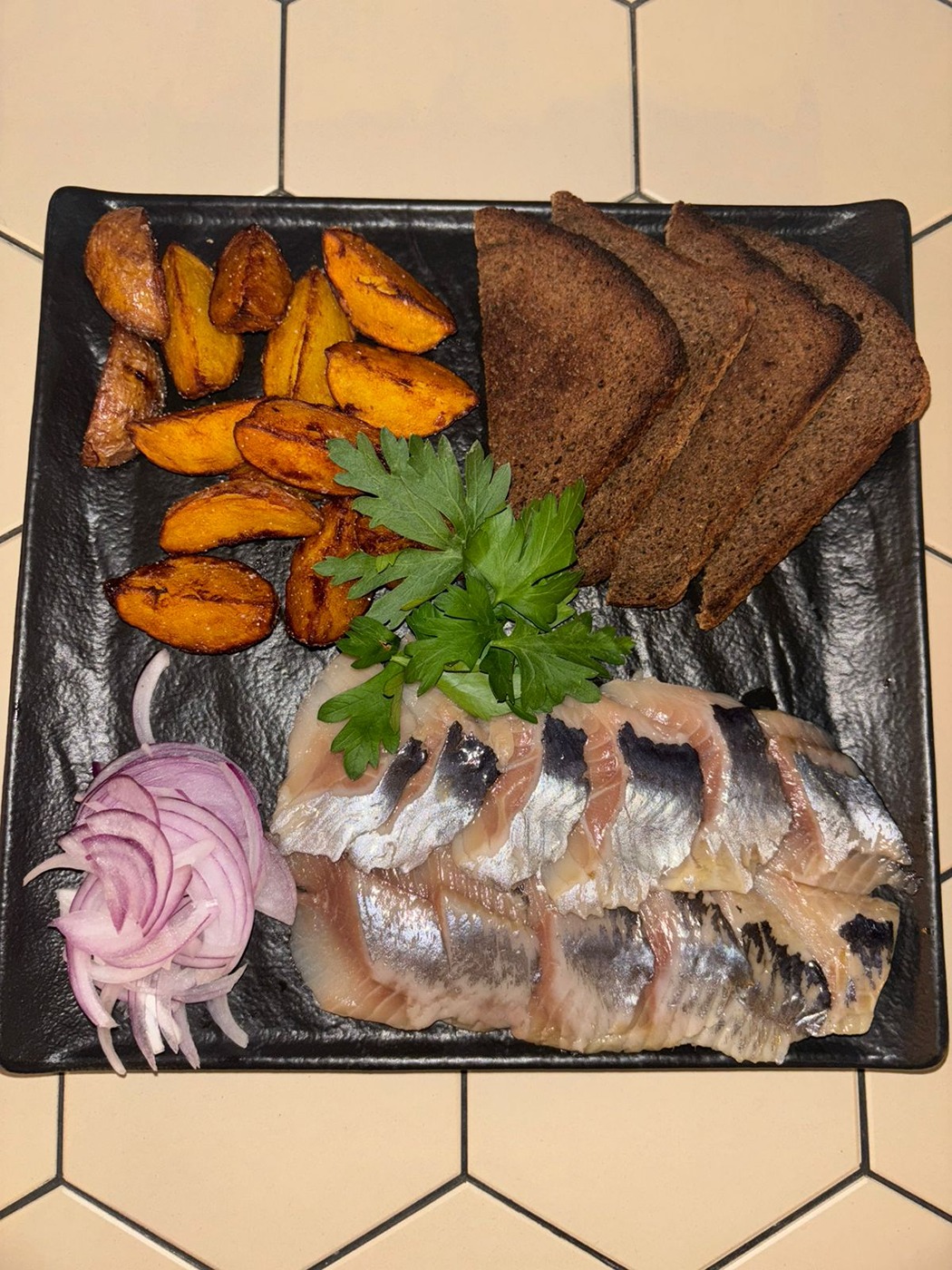 Малосольная селёдка, Картофель по деревенский, лук маринованный, горчица. 270 гр.
