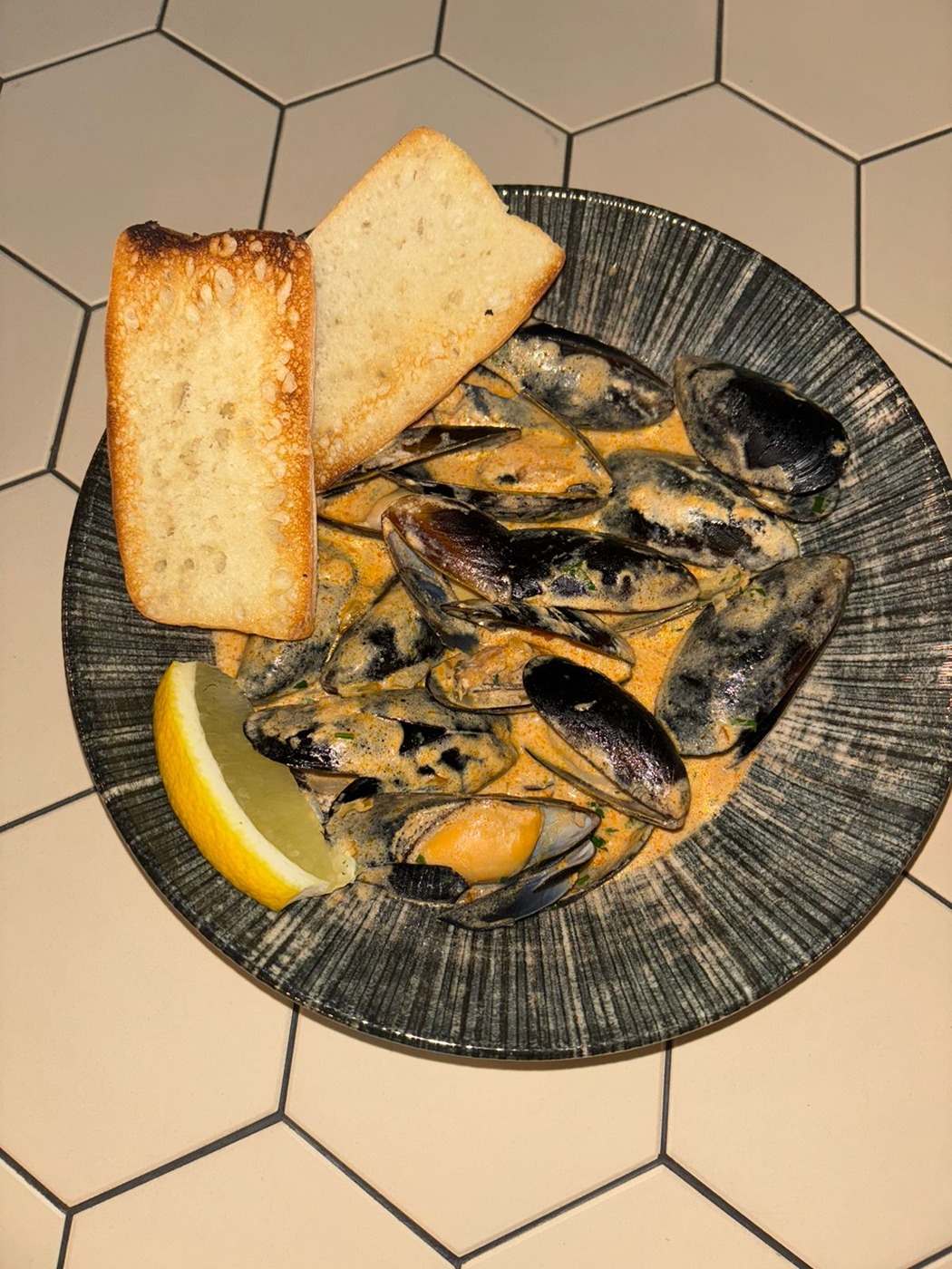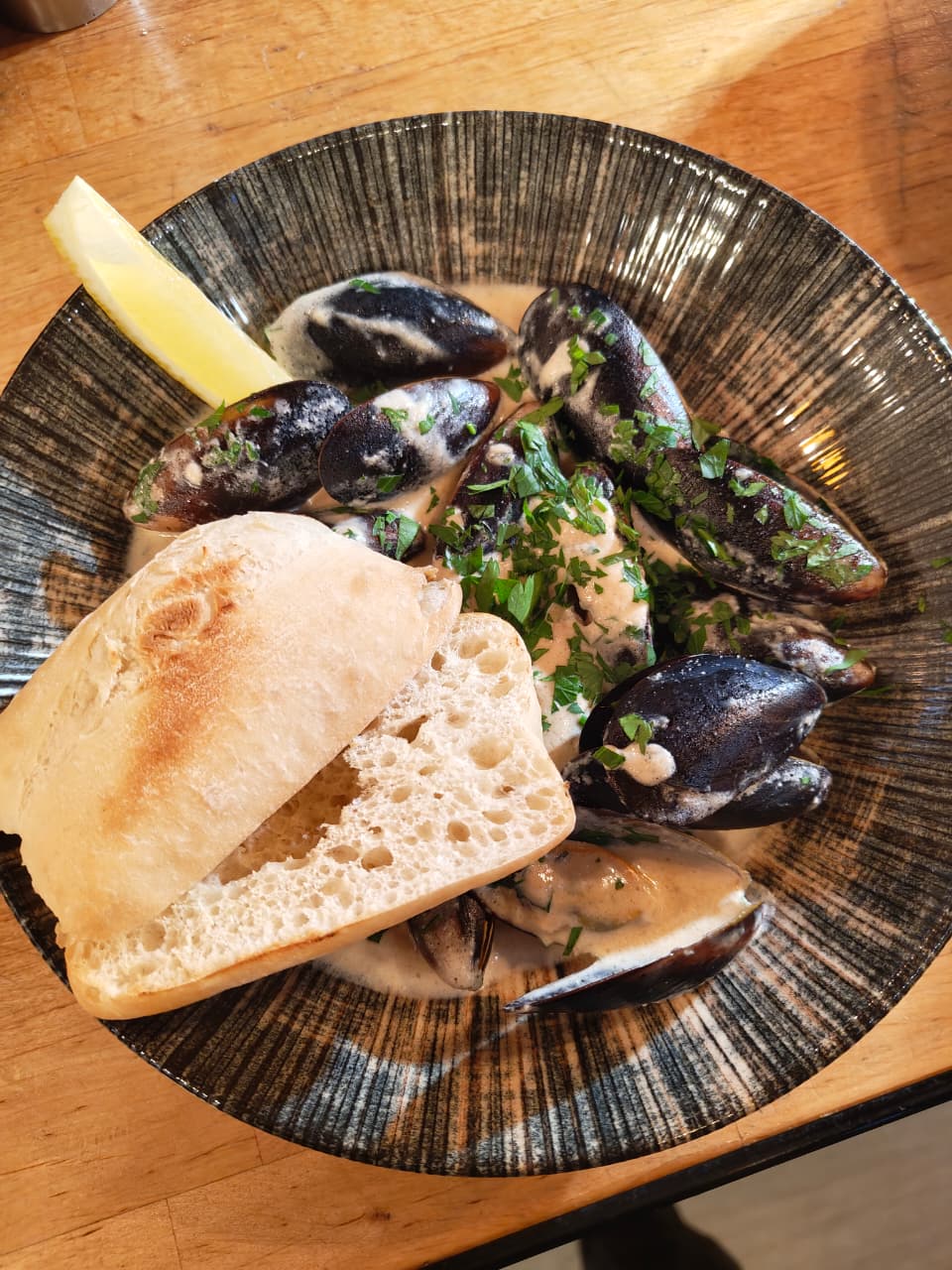 Мидии, сливки, чиабатта, зелень, дор блю. 350 гр.