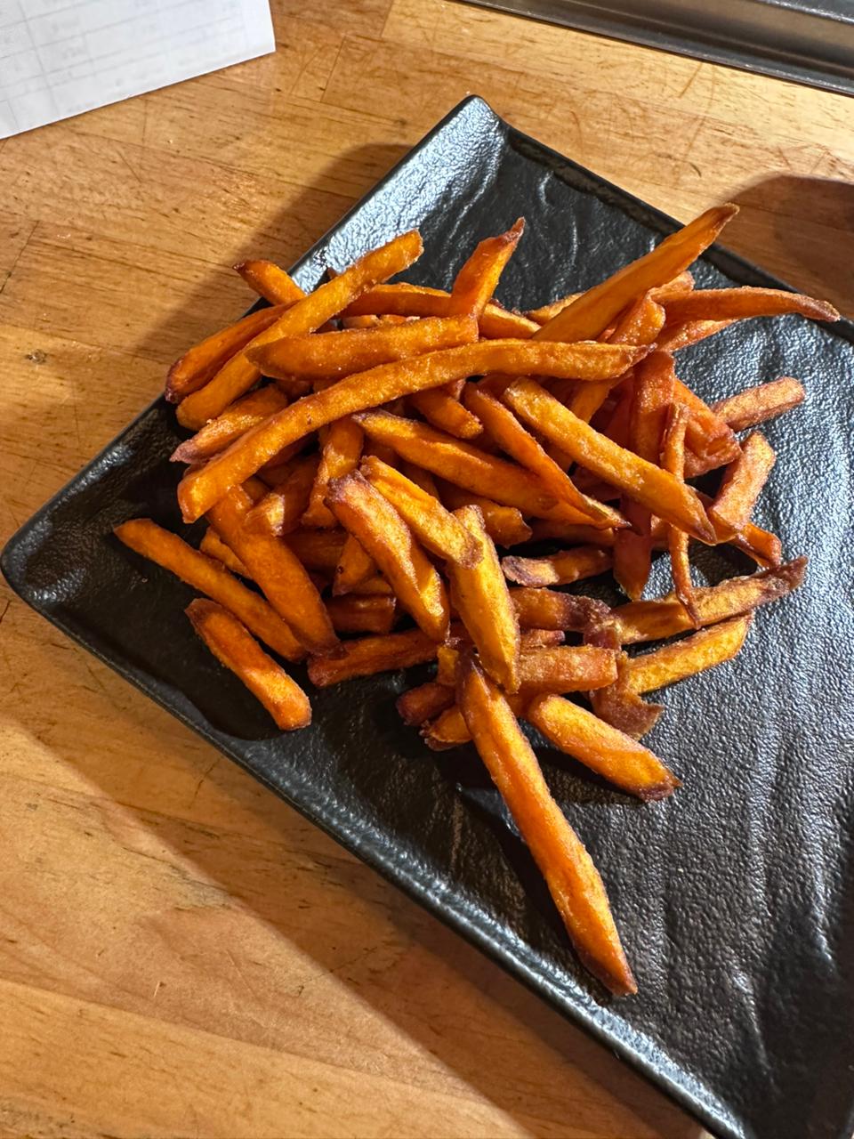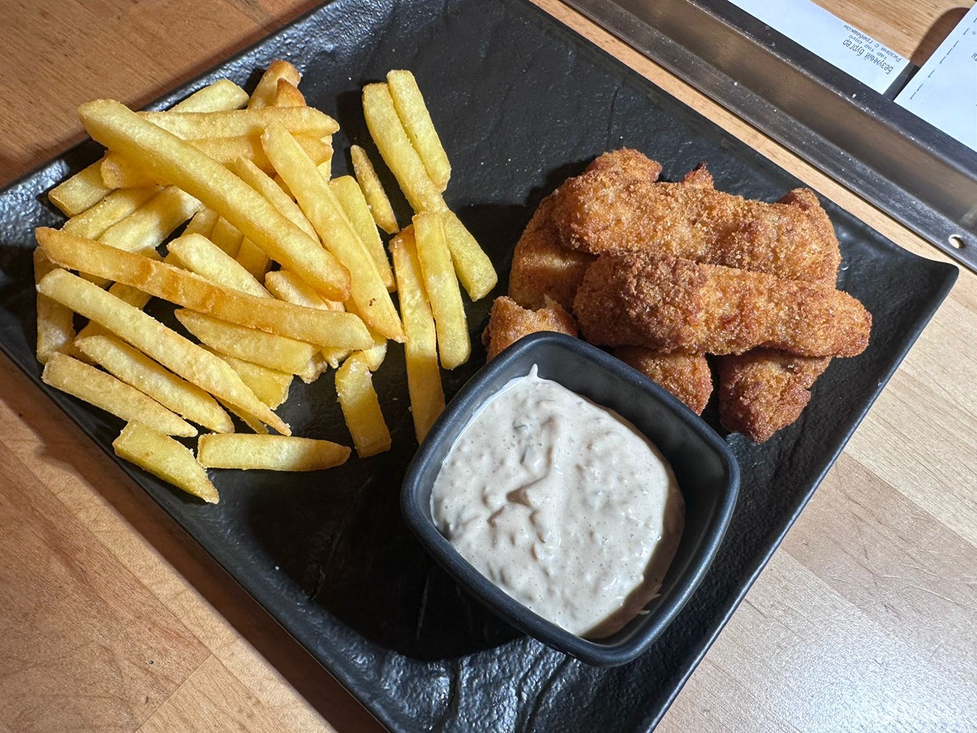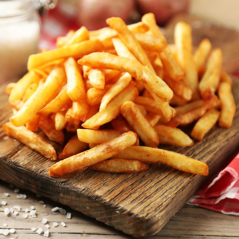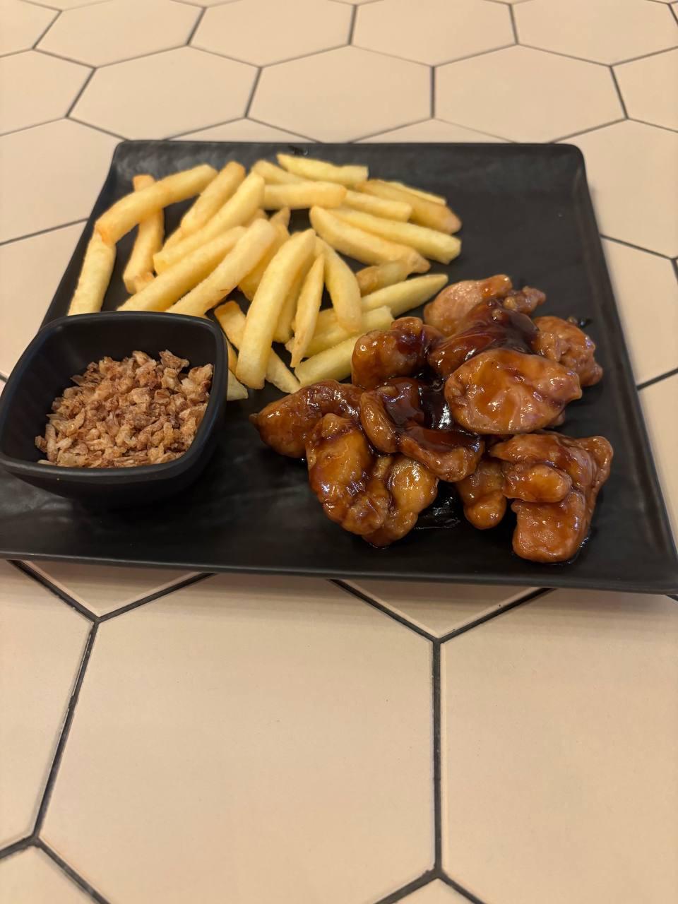 Куриное филе, обжаренное в кукурузном крахмале с добавлением соуса токио, картофель фри, лук фри 260 гр.