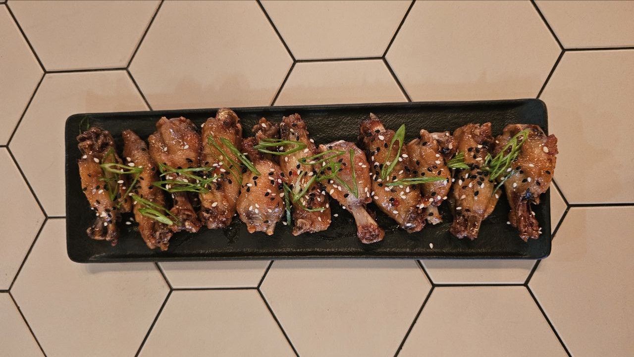 Крылышки, соус терияки, сладкий чили, масло сливочное. Вес 450 гр.