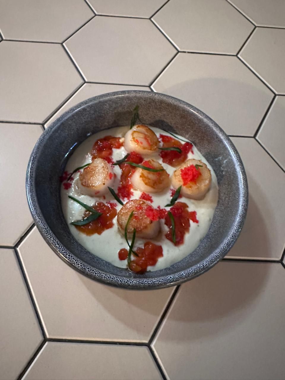 Судак, креветки, шампиньоны, лук красный, масло оливковое, сливки, лук зеленый, дайкон, лайм