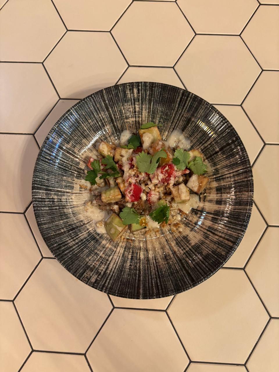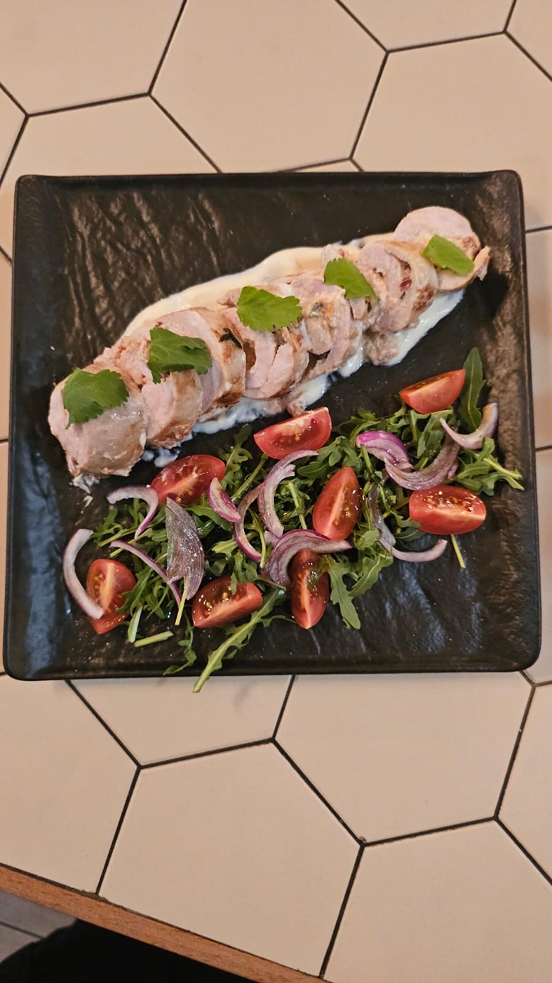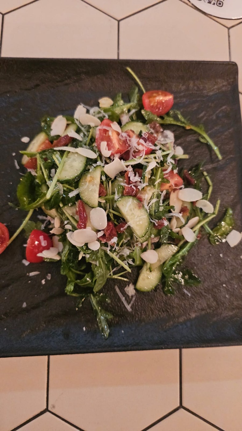 Грудинка, брынза, вяленные томаты, чеснок, грецкий орех, петрушка, табаско копченный. Руккола, черри, редис, красный лук, бальзамик