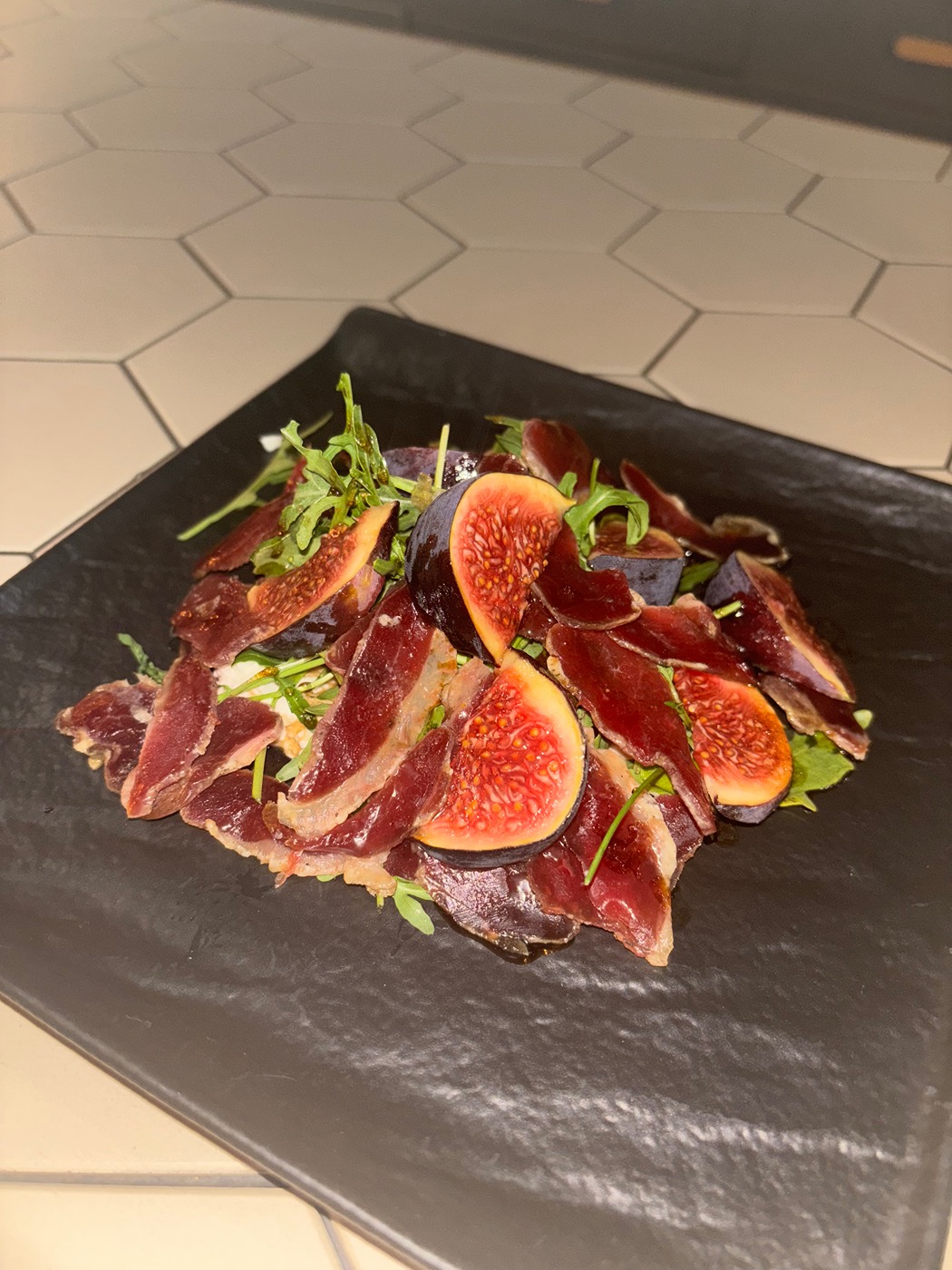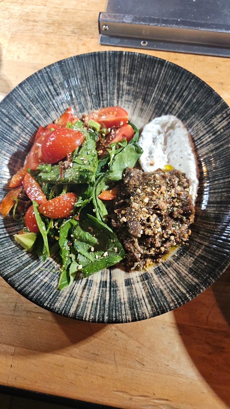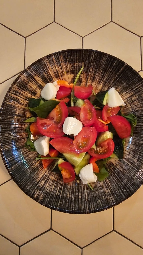 Грудинка, брынза, вяленные томаты, чеснок, грецкий орех, петрушка, табаско копченный. Руккола, черри, редис, красный лук, бальзамик