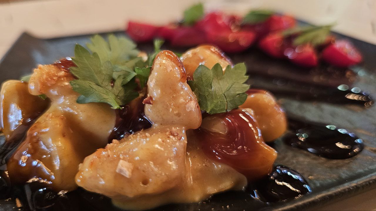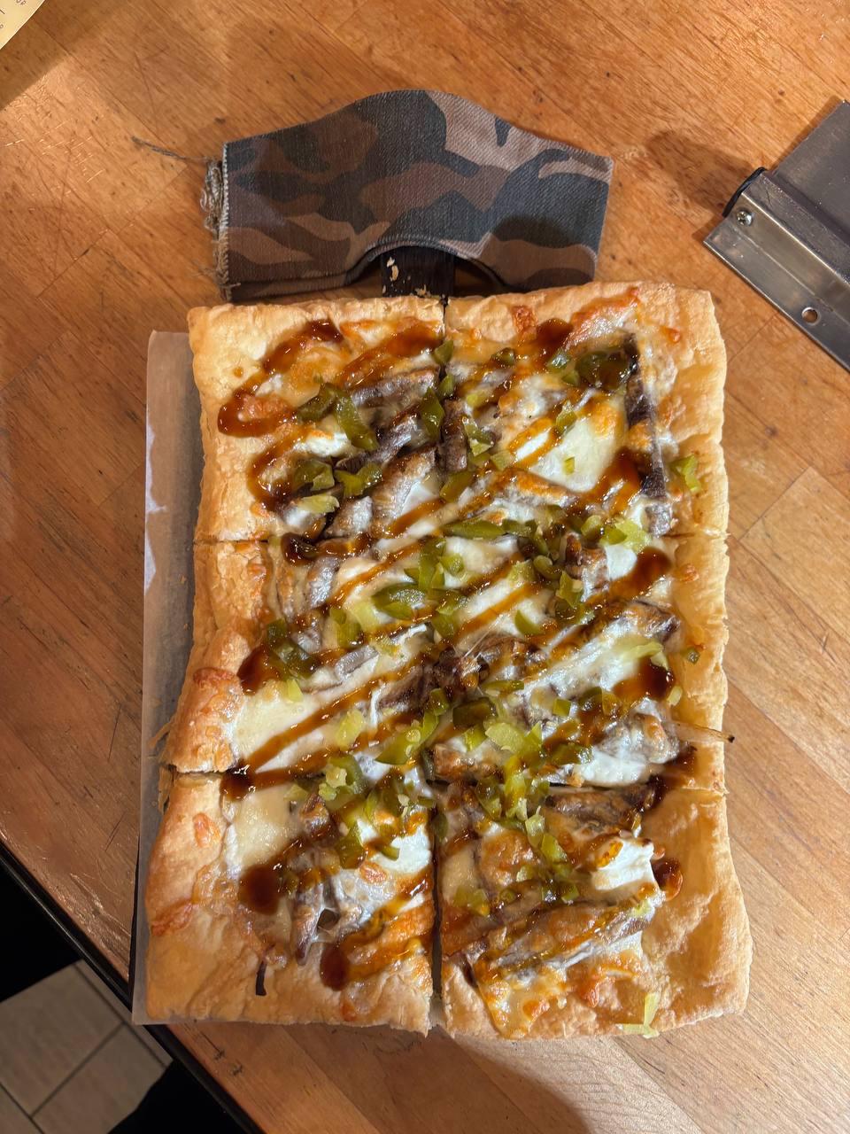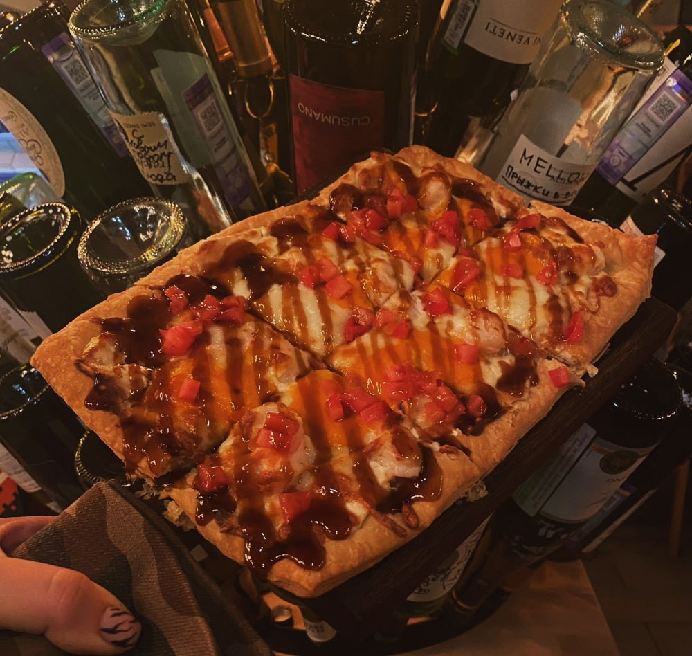 Слоеное тесто, тигровые креветки, помидоры, сыр моцарелла, чесночный и сырно-устричный соус, сверху поливается соус терияки. 330 гр.