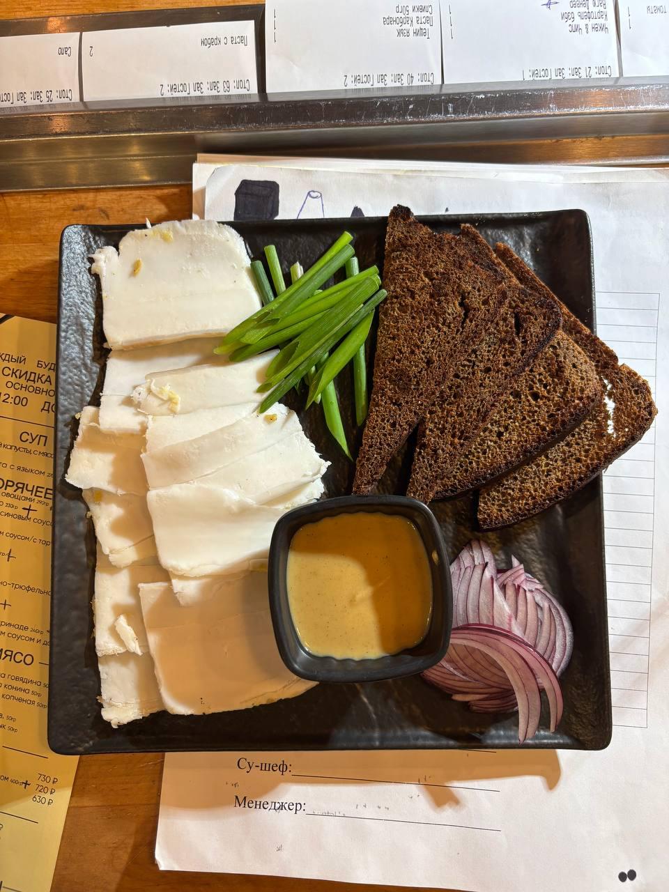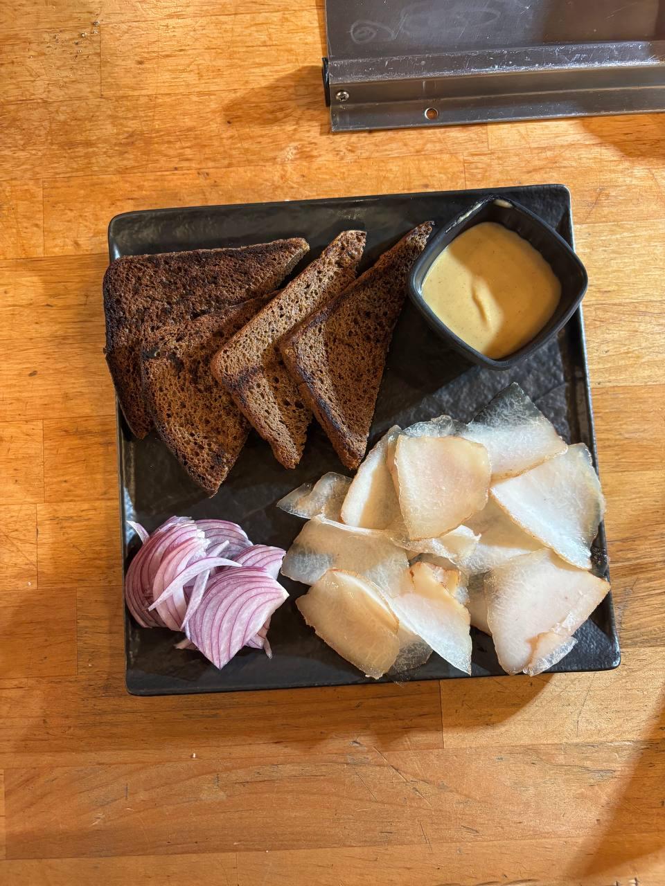 Сало свиное, Бородинский хлеб, лук красный, горчица, лук зелёный 155 гр.
