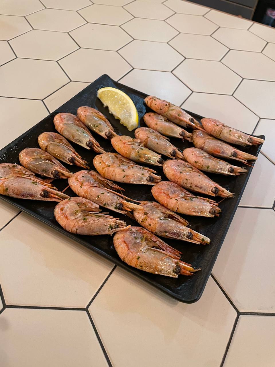 Жаренные или охлажденные 340 гр. Креветки жареные, лимон, соевый соус, заправка из чесночного масла